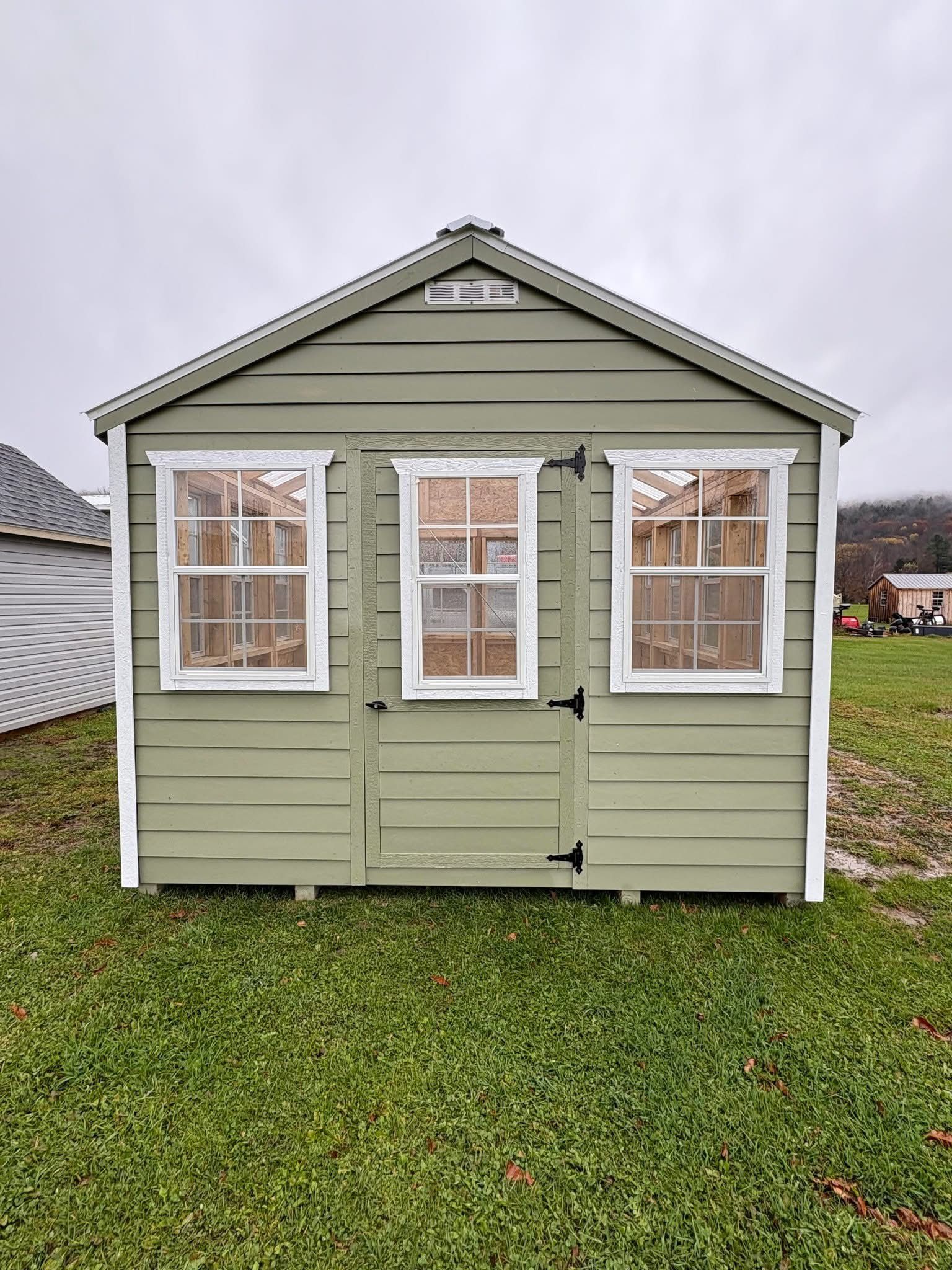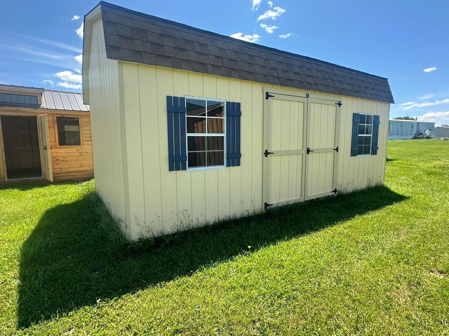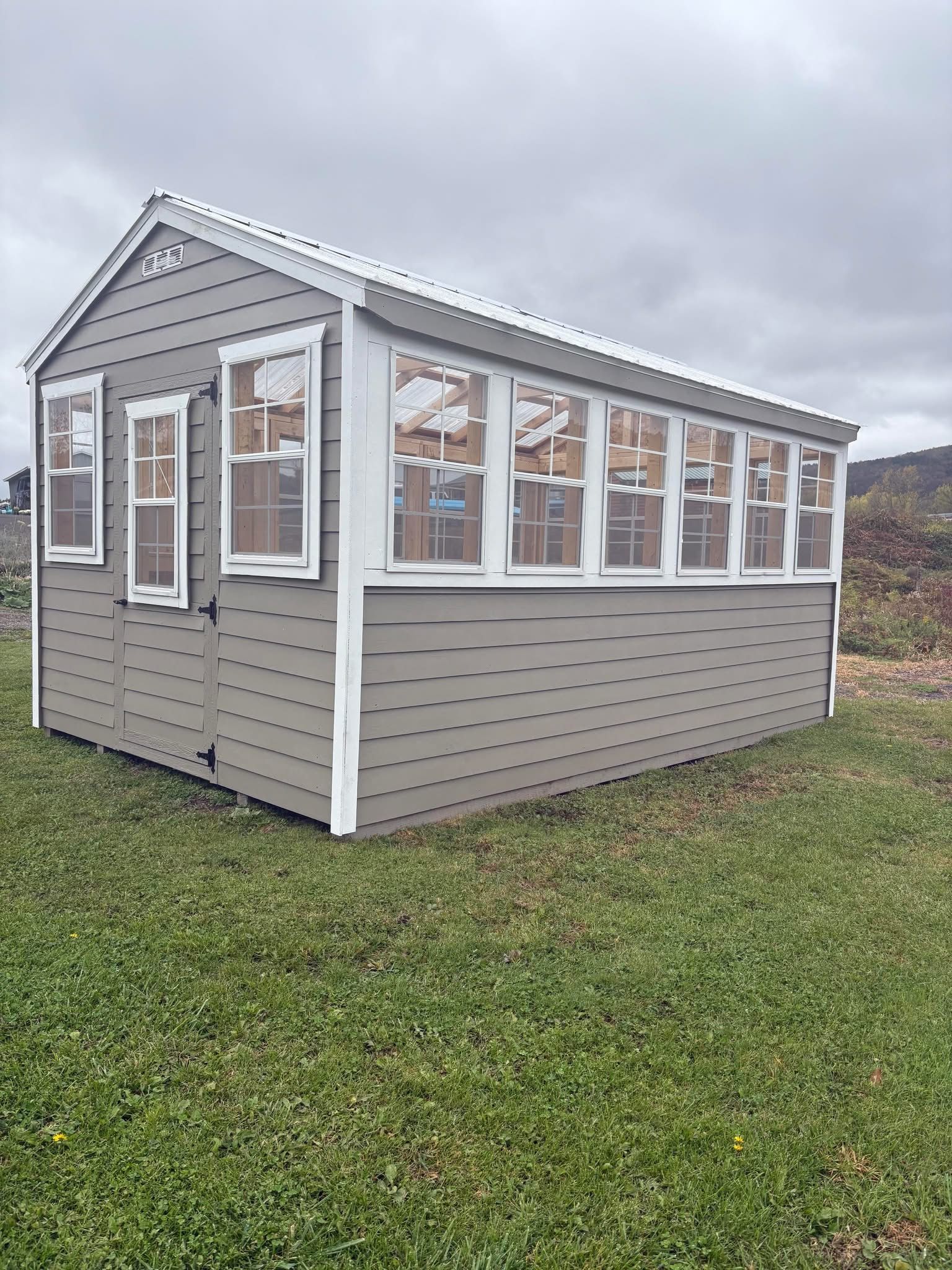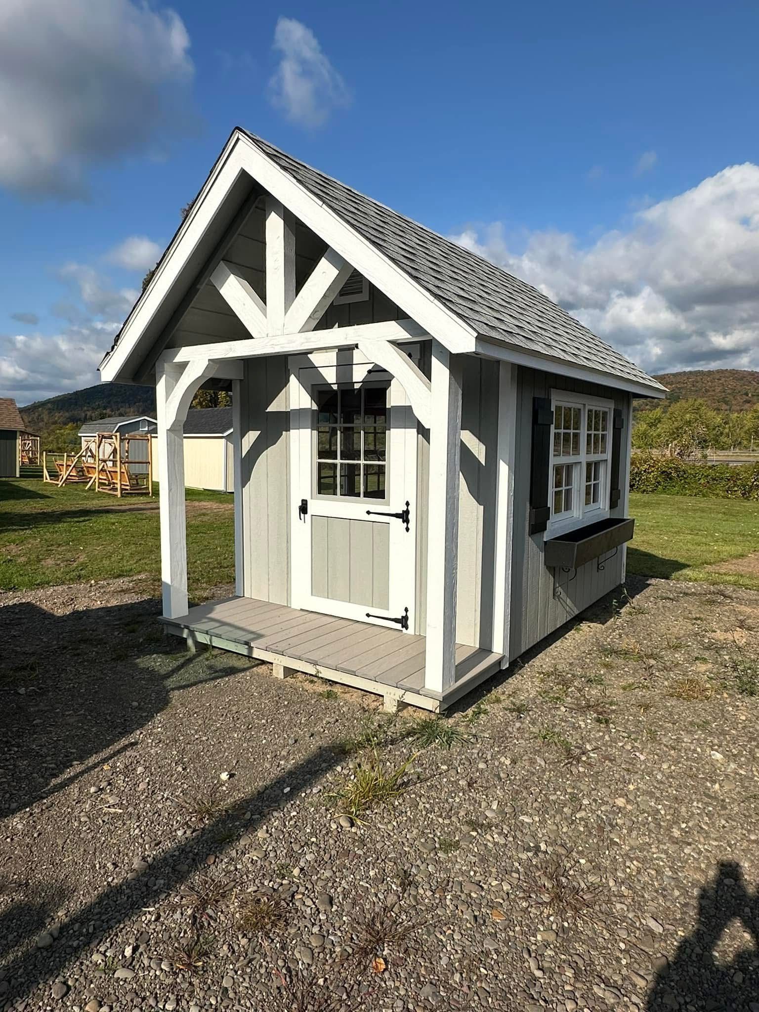 A gray and white shed with black shutters is sitting on top of a lush green field.