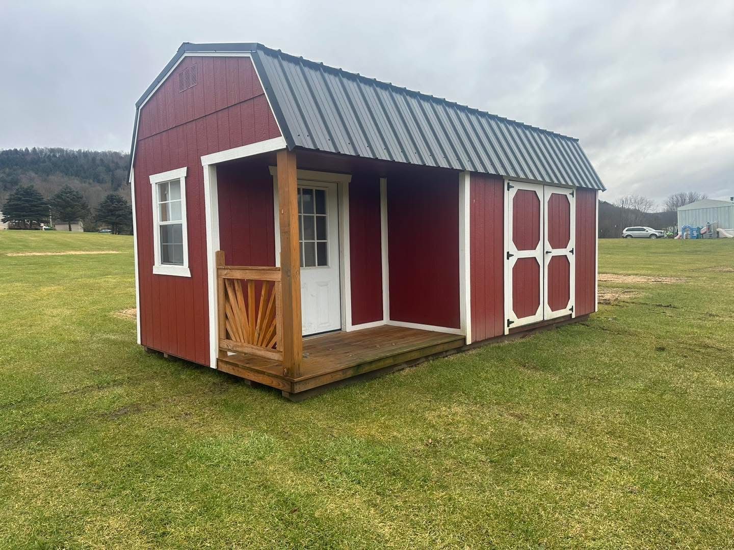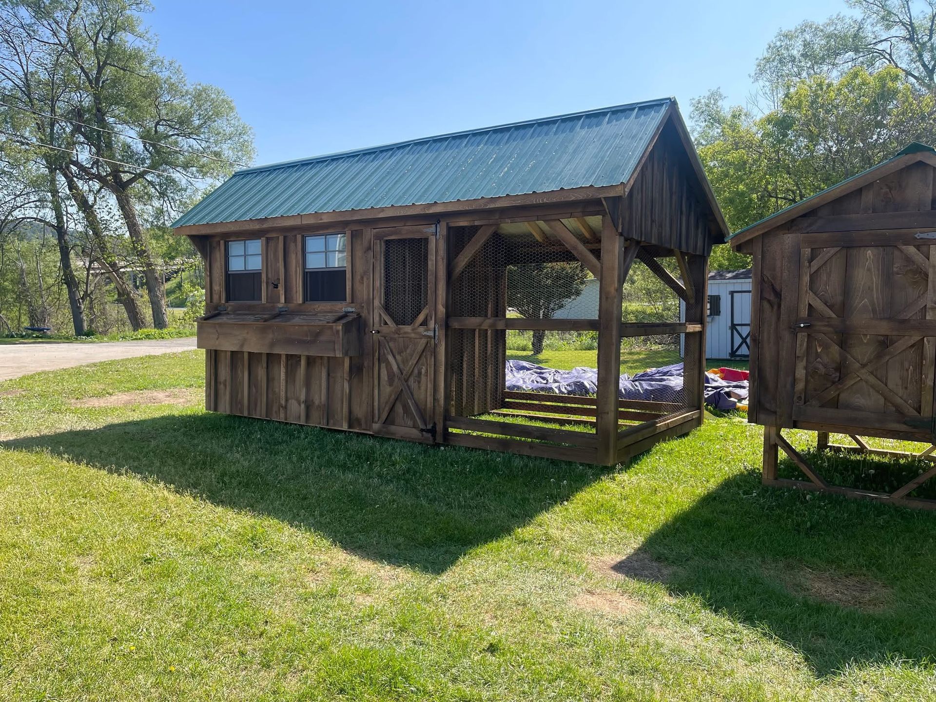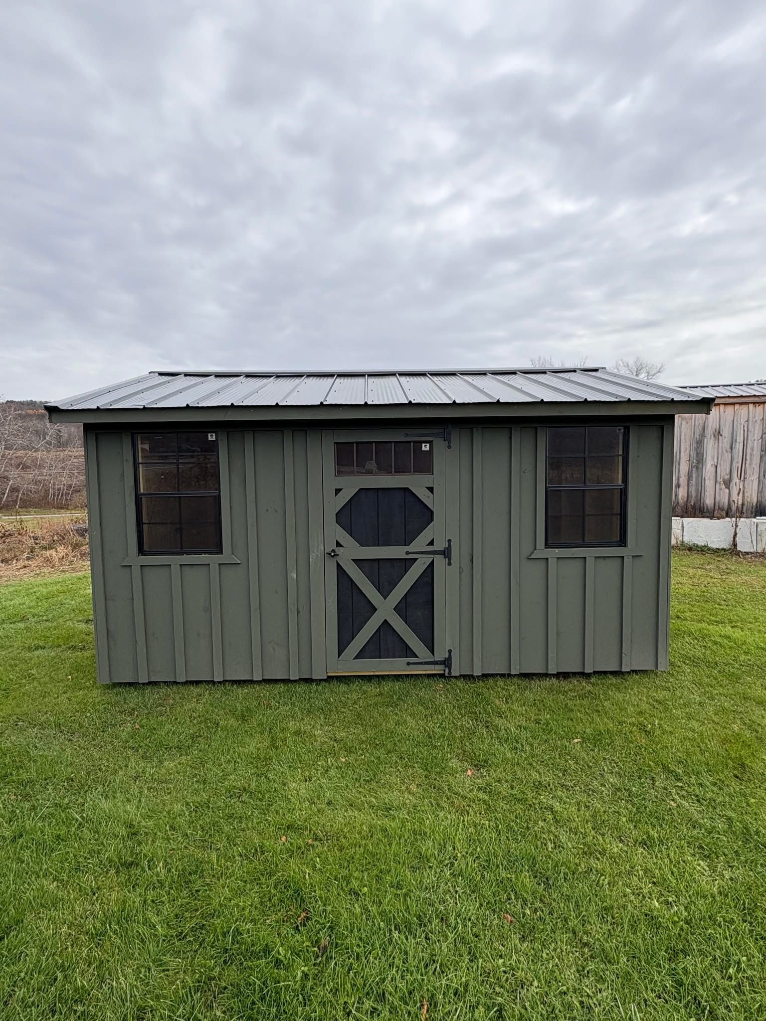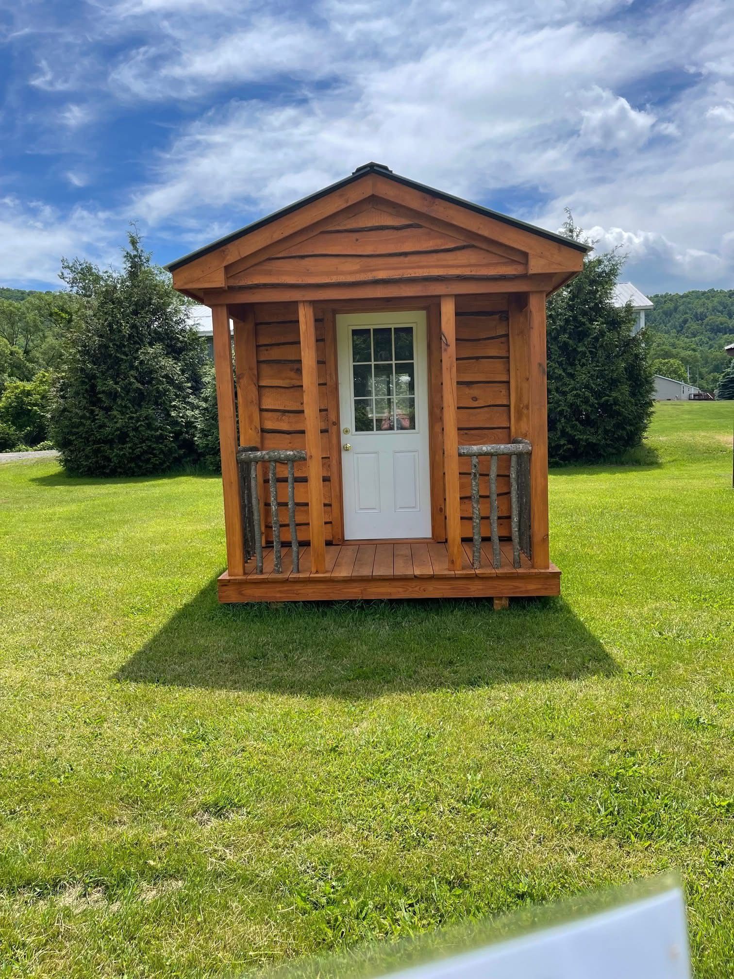 A small wooden shed with a screened in porch is sitting in the grass.