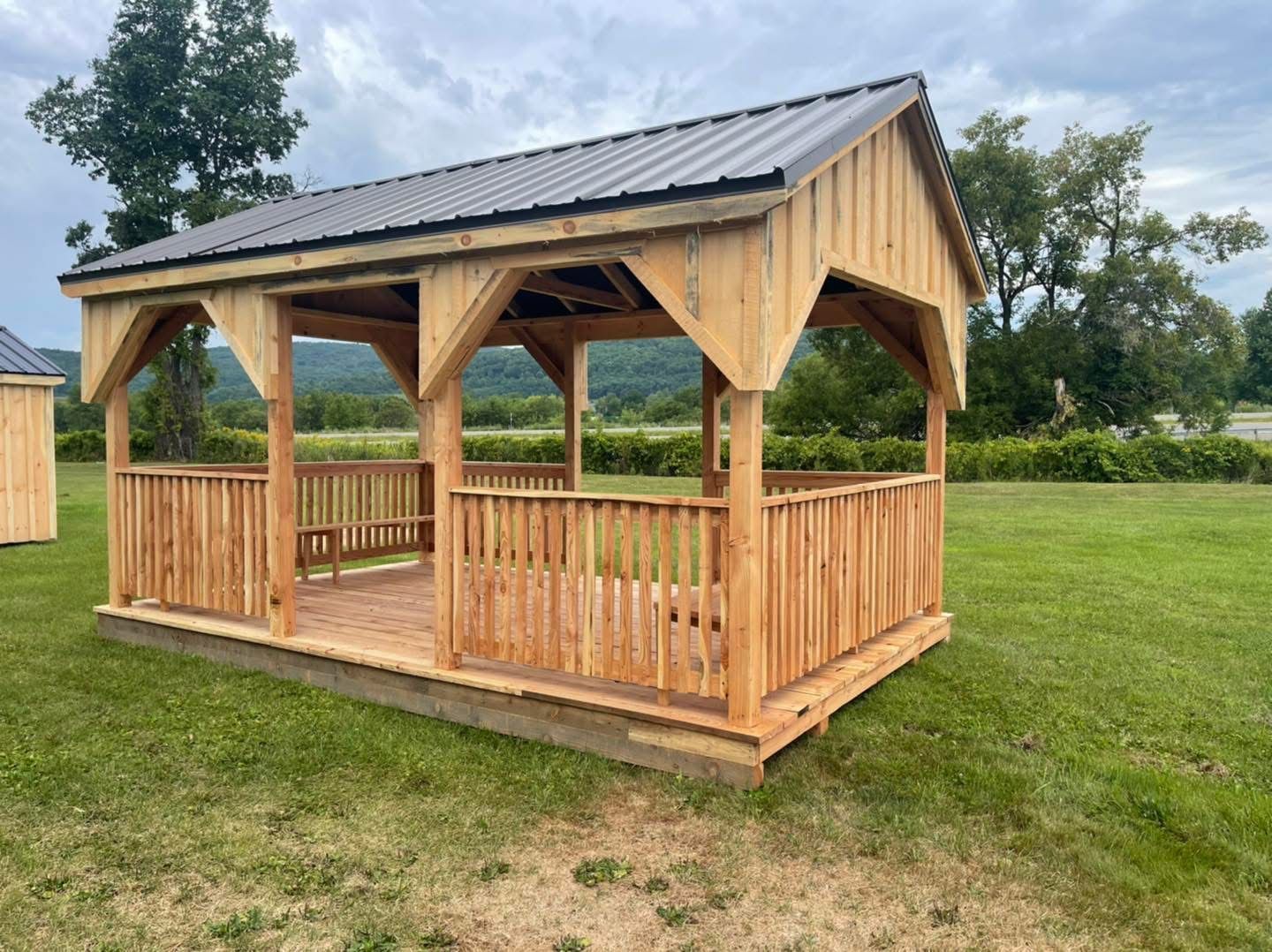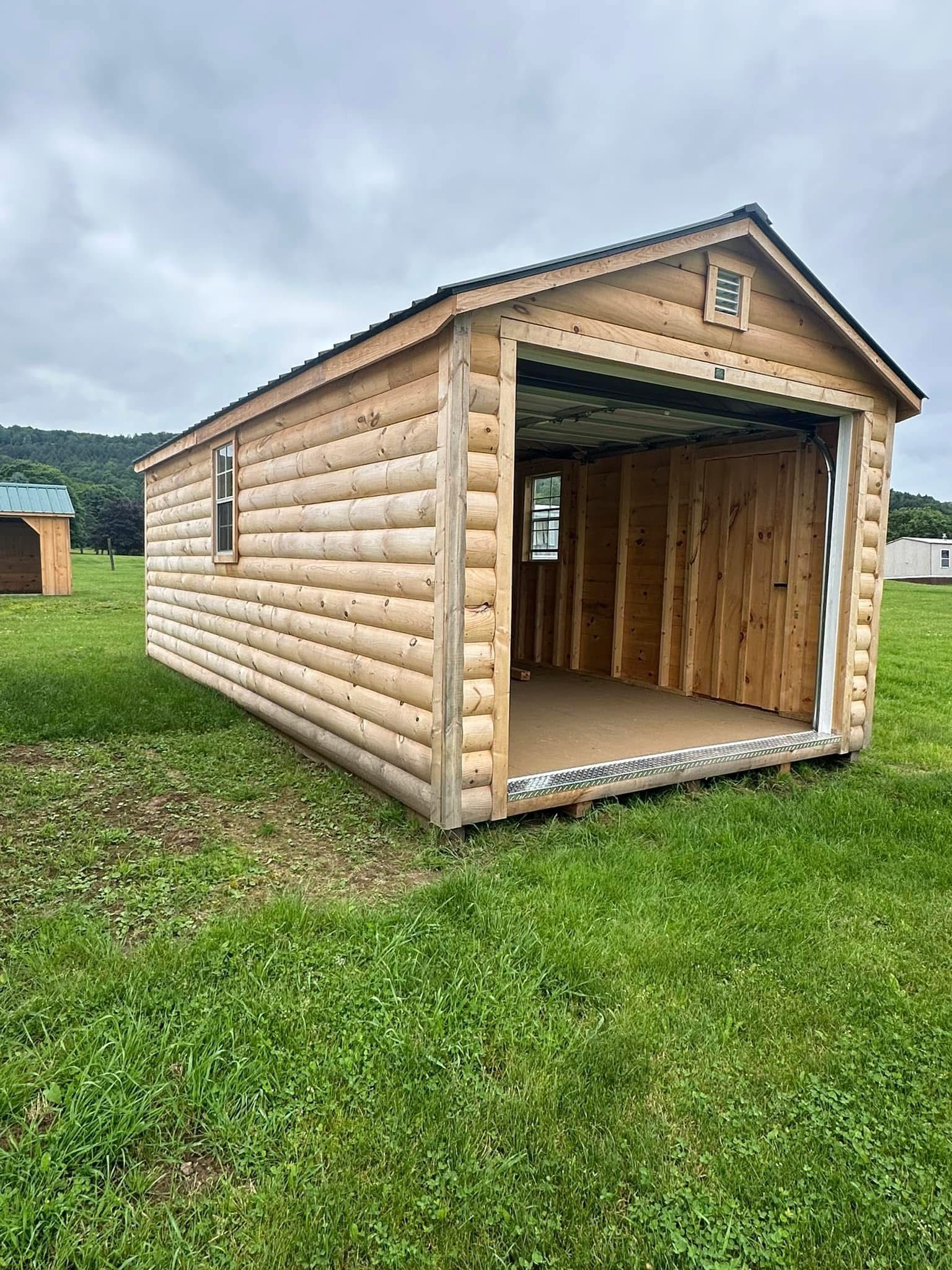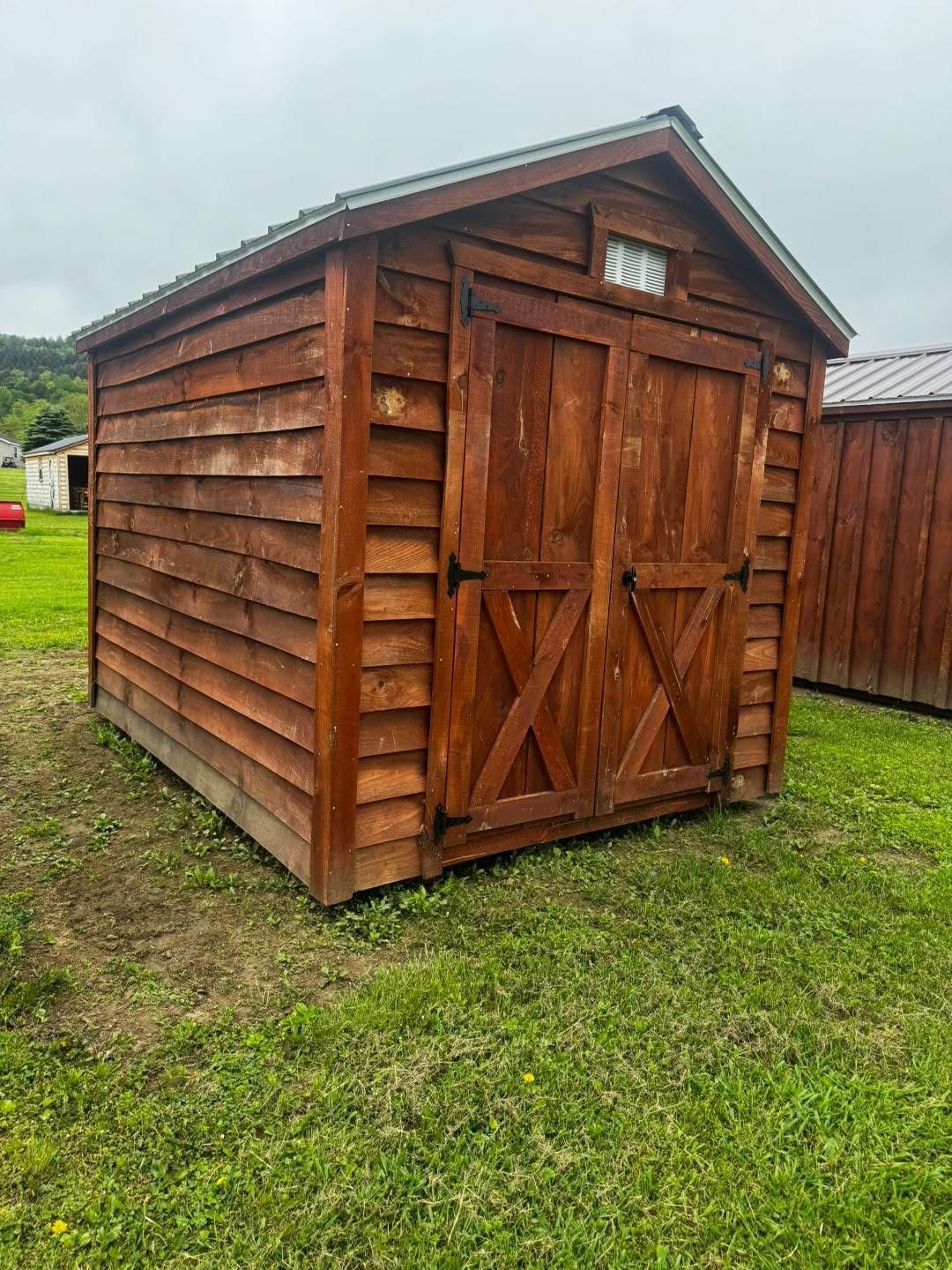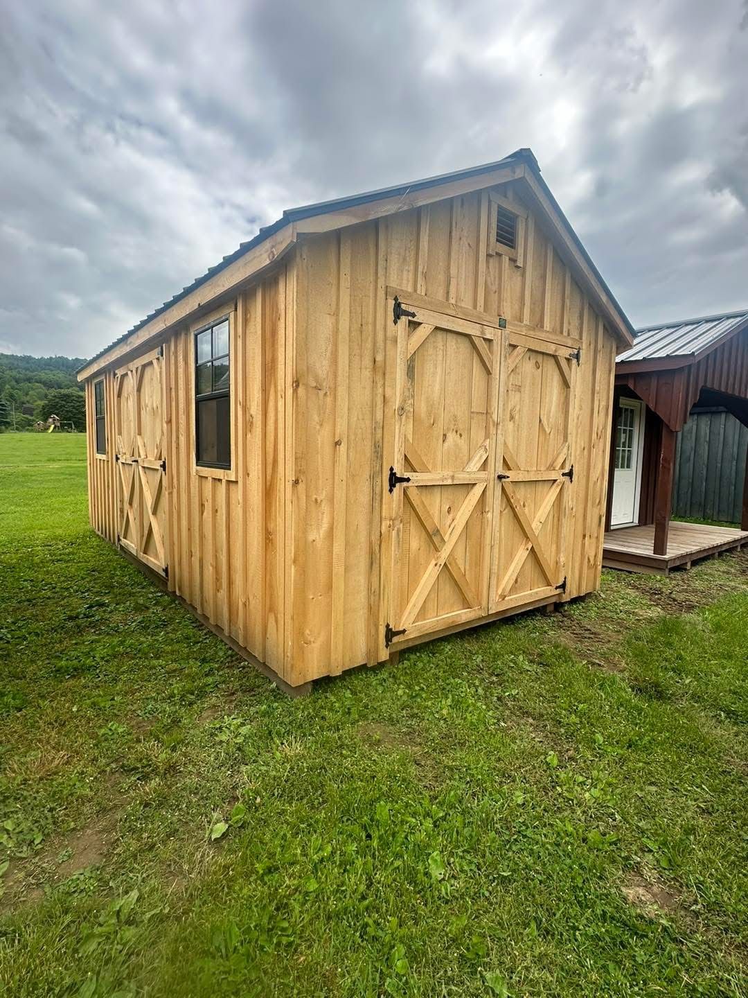 A small wooden shed with a screened in porch is sitting in the grass.