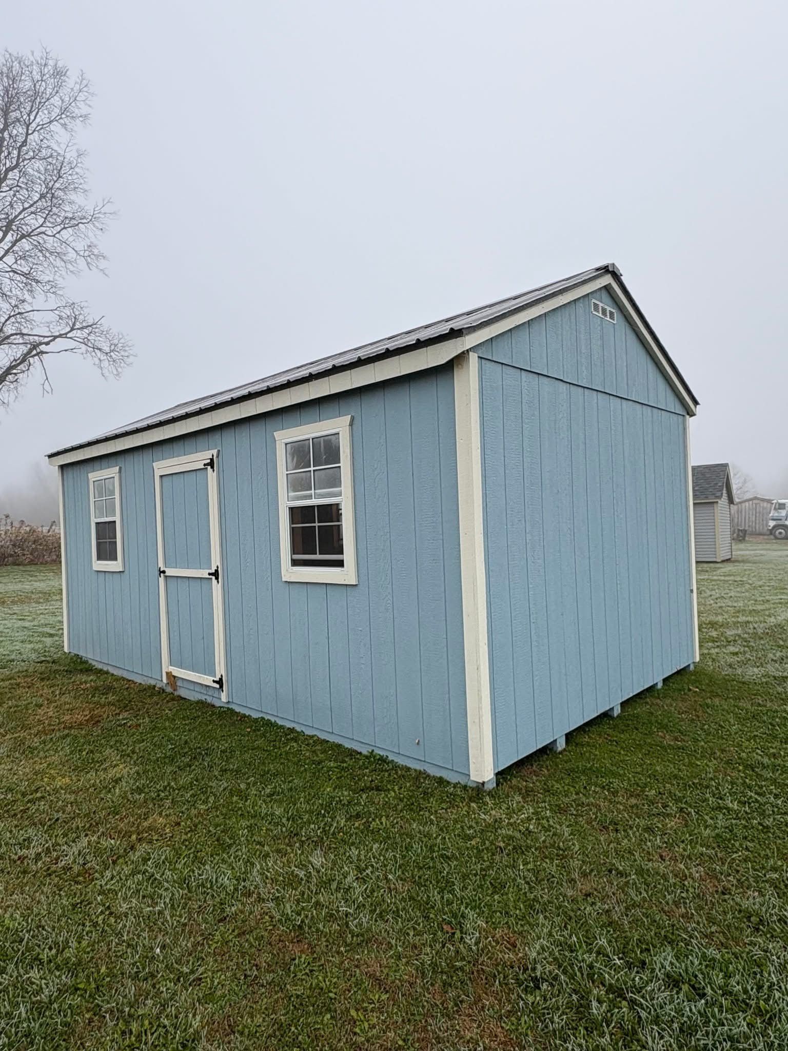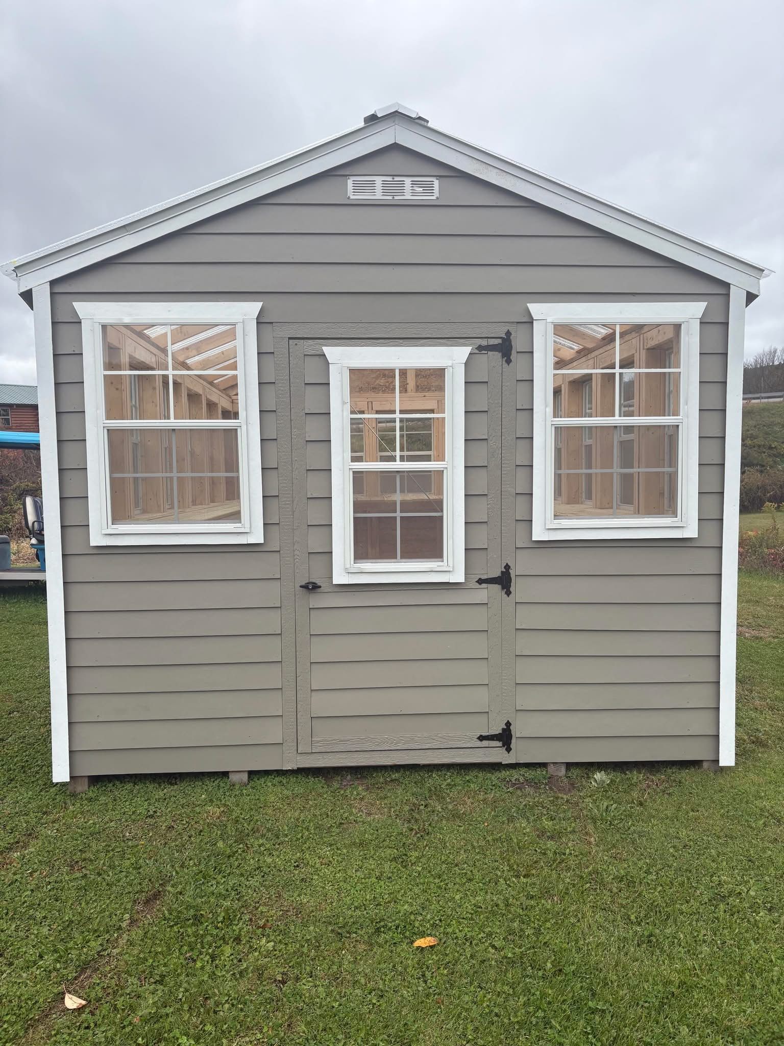 A gray shed with white trim and shutters is sitting on top of a lush green field.