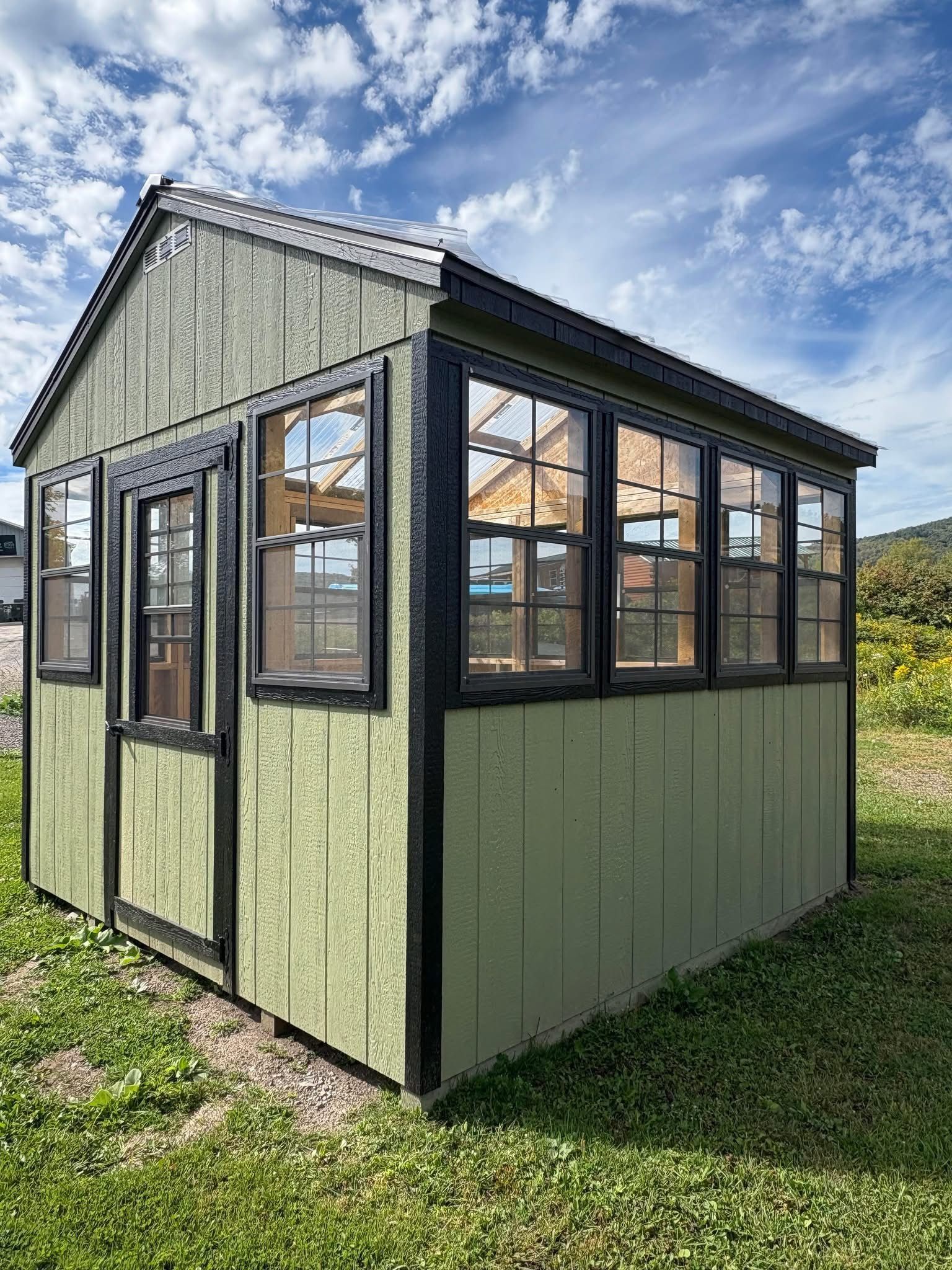 A green shed with white trim is sitting in the middle of a grassy field.