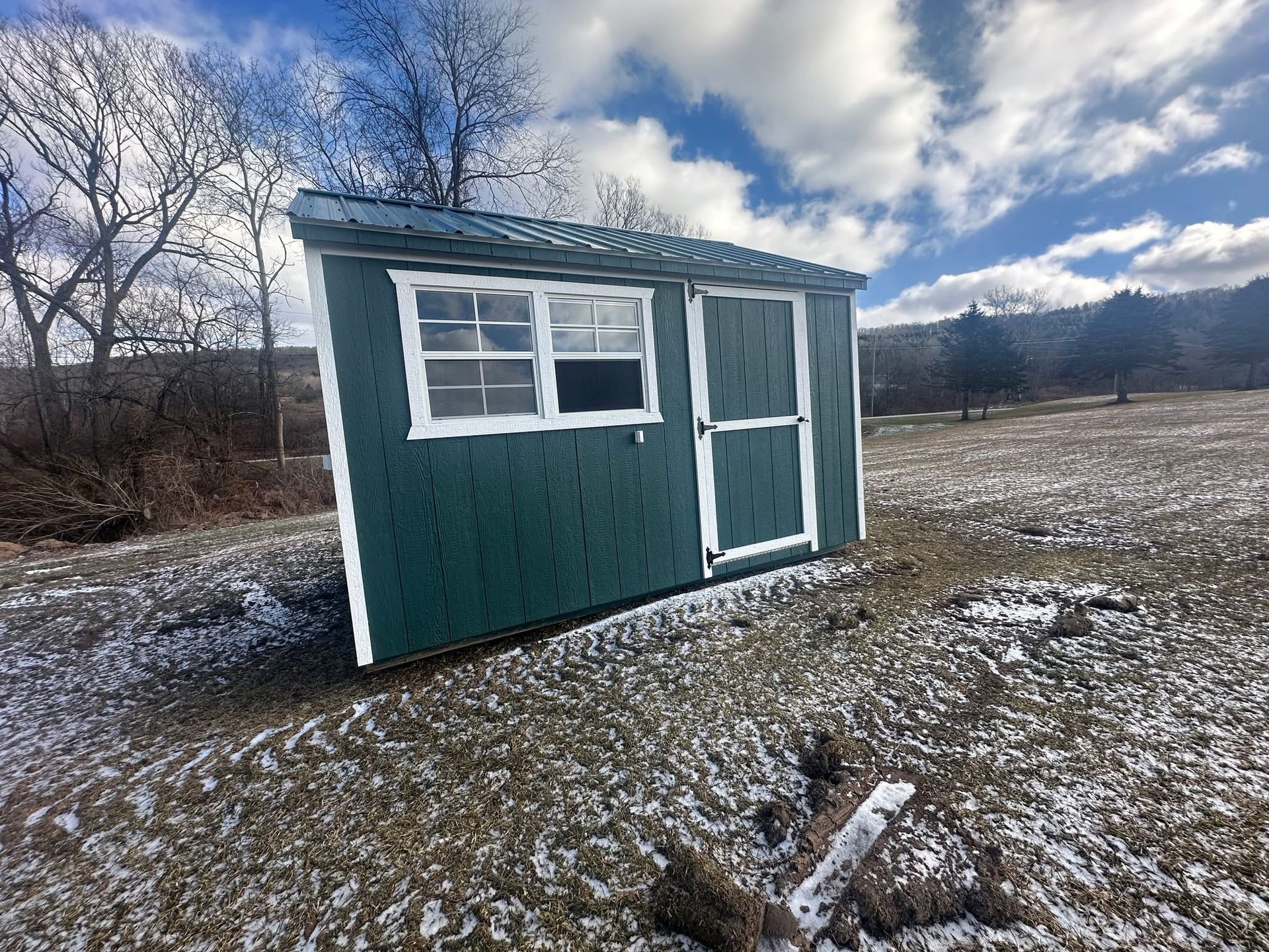 A green and white shed is sitting in the middle of a snowy field.