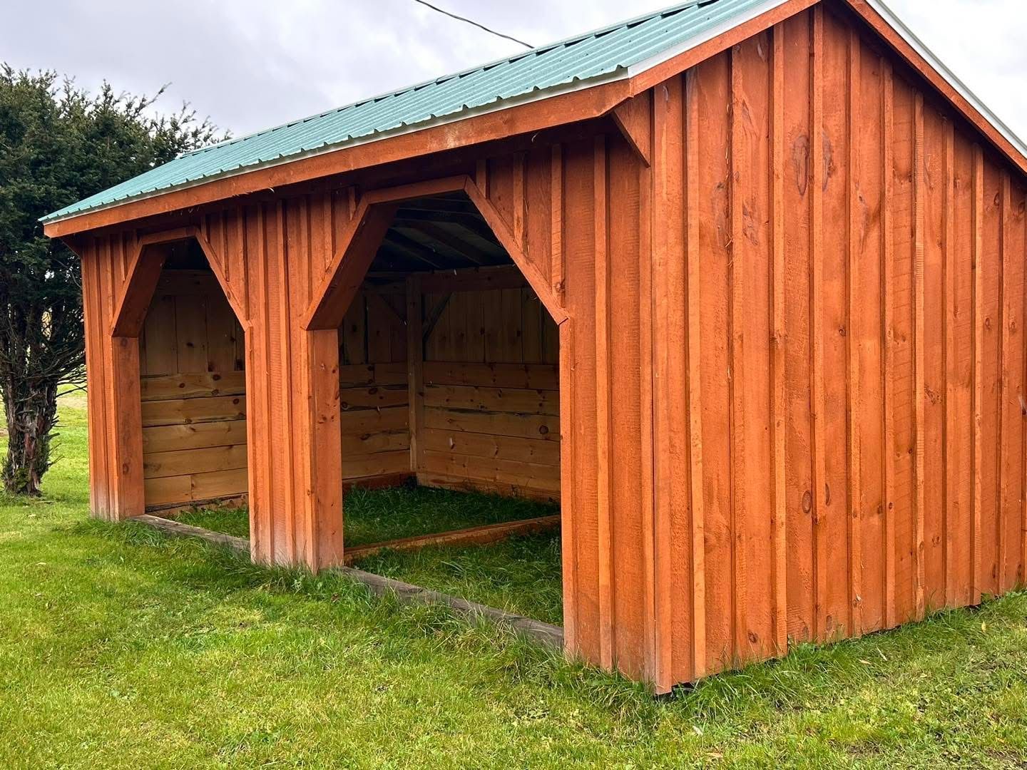 A wooden shed with a green roof is sitting in the middle of a field.